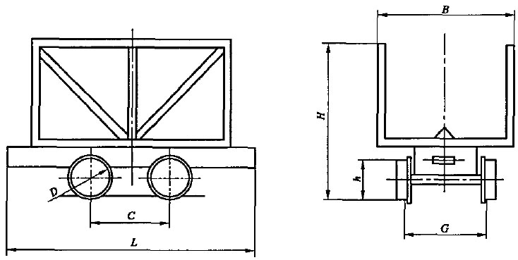 | 型號(hào) | 裝載 量/t | 軌距G | 外型尺寸 | 軸距 C | 輪徑 D | 牽引 高度 h | 允許 牽引 力/kN | 最小平 面運(yùn)行 半徑 m |